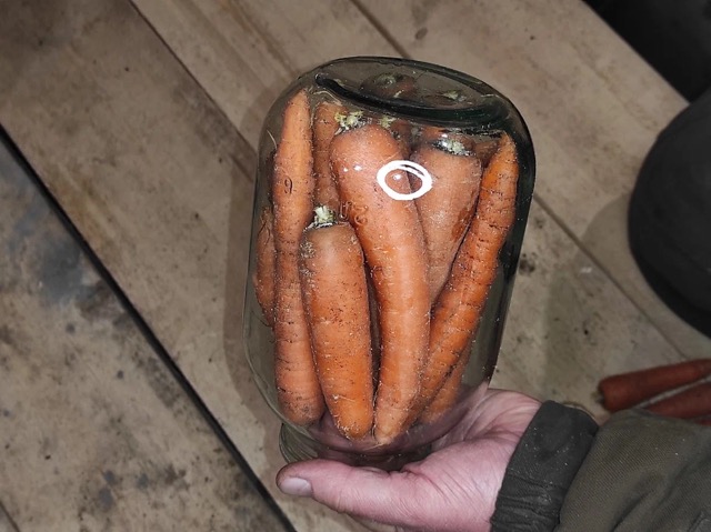 Наповнені банки не потрібно закривати, їх просто ставлять донизу шийкою на полиці або на підлогу. Місце має бути сухим і прохолодним, у ньому морква відмінно пролежить до весни, навіть мишки її не спробують. Ми її так і дістаємо з льоху банками.